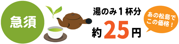 当園人気の松島(100g 1,000円)を1煎だけ淹れた場合ですので、2煎目・3煎目や、松島より安価な茶葉ならもっとお安くなります!